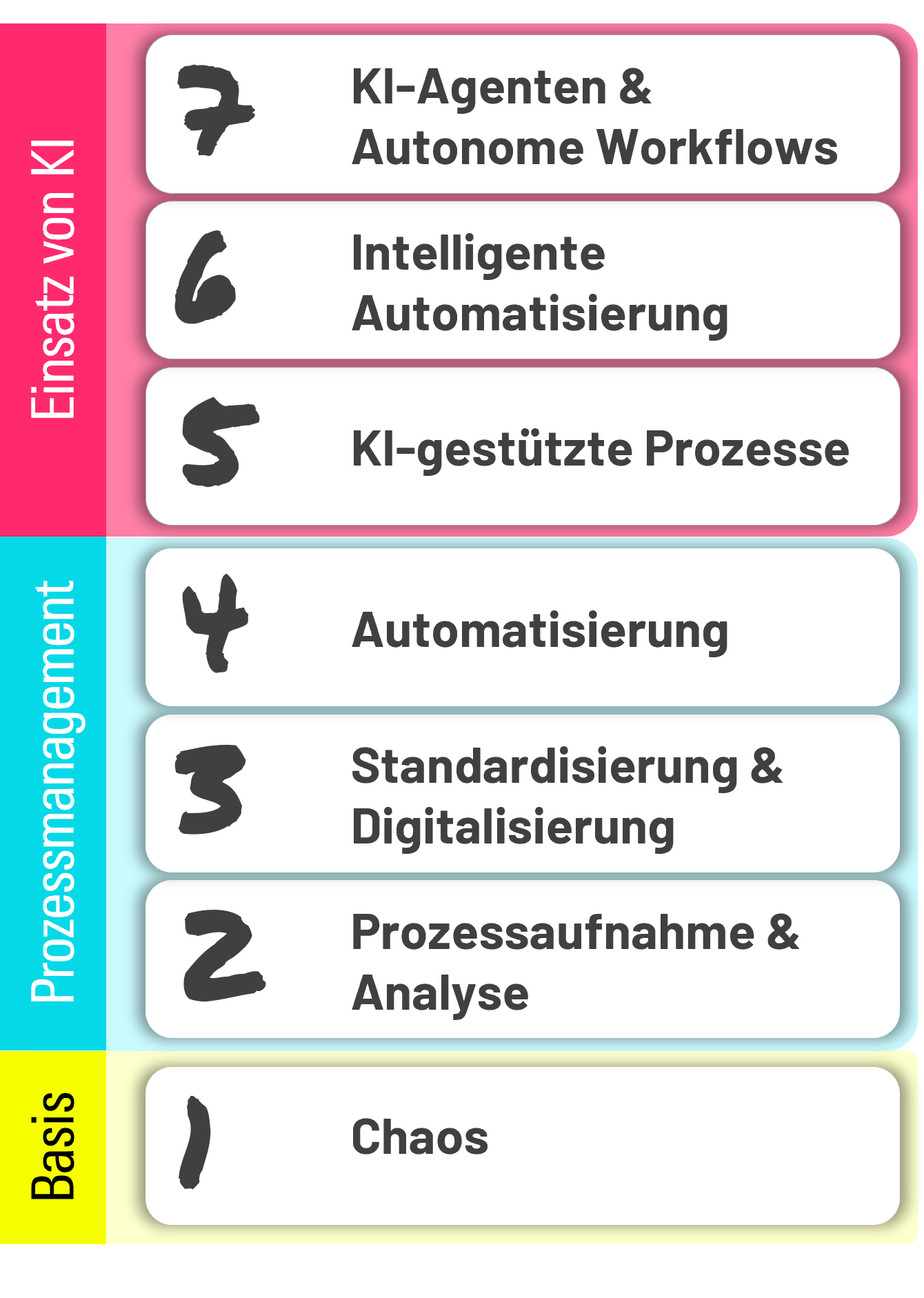 Unternehmen entwickeln sich von unstrukturierten Abläufen zu stabilen, automatisierten und KI-gestützten Prozessen. Der erste Schritt ist volle Transparenz: Reale Workflows werden sichtbar, Schwachstellen erkannt, ineffiziente Routinen identifiziert. Dadurch entsteht eine klare Grundlage für echte Prozessoptimierung. Wenn Abläufe digitalisiert und standardisiert werden, sinken Fehlerquoten, Bearbeitungszeiten verkürzen sich und die gesamte Organisation arbeitet schneller und zuverlässiger.